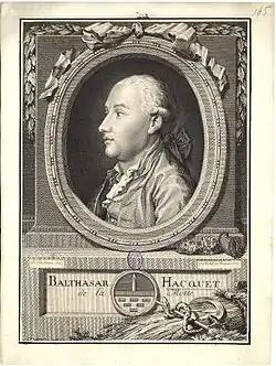 Hacquet studied in Vienna, and was a military surgeon during the Seven Years' War (1756–1763). From 1766 until 1773 he was the miners' surgeon and obstetrician in Idrija. In 1772 he became member of the Carniolan Agricultural Society. In 1773 he became a teacher of anatomy, physiology and obstetrics at Ljubljana Lyceum. From 1787 until 1805 he was a professor at the Lviv University (University of Lemberg). Then he worked in Kraków, where he stayed until 1809. In 1807 he became dean of the Medical Faculty. From 1810, when he retired, he lived in Vienna.[2]