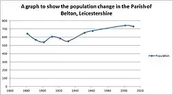 The earliest record of population in Belton was in 1801, when there was a total of 586 residents in the area. This increased steadily for 50 years to 751. However, a gap in the dataset from 1851 to 1881 shows there was a significant drop between here to 645. From 1881 there was a steady decline until 1911, where after that there has been a steady increase to a current population of 734.[9] This could be down to the boundary changes that happened between 1931 and 1934 which changed the acreage and population of Belton.[10] The 2011 census recorded that 49% of the village was male and 51% female which suggests the gender distribution is rather well balanced.[11]