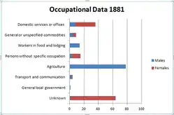 The most common occupational area of the time was agriculture. This is more than likely due to the surroundings of Belton; the parish has vast surroundings of arable land still used today. This factor, along with the fact that jobs today may not have existed back then, meant there was a limited number of professions to go into. Agriculture, unsurprisingly, was dominated by males at the time, whereas many of the women's occupation were unknown, or in domestic services.[7]