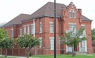 The Ben Hill County Jail is a historic building in Fitzgerald, Georgia, located on Pine Street. It was built in 1909 in the Romanesque style, the first jail in the 1906-created county. It was designed by J. Reginald MacEachron, selected by a design competition in which 14 architects submitted proposals for the county's courthouse and jail. It is two stories high on a raised basement. It originally had an elaborately corbeled battlemented tower, but it was shortened between 1920 and 1935. The south entrance leads to the sheriff's living quarters which was used by the sheriff and his family until the 1950s. It was used until not too long before 1982.[2]