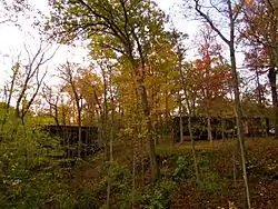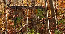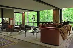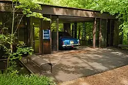 The property sits "surrounded by trees in a ravine" and "was held up as a model for steel home craftsmanship."[2] Textile artist Ben Rose and his wife, Francis, moved into the property the same year. An adjoining pavilion meant to showcase the Roses' collection of exotic sports cars was added by David Haid, Speyer's student, in 1974.[3] The house was designated an official local landmark in 1987.[4] The two buildings are steel framed, rectangular, glass-and-wood boxes, and similar to Mies' iconic Farnsworth House, are both lifted off the ground on pylons.[1]