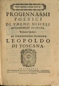• Fioretti, Benedetto (1638). Proginnasmi poetici. Vol. 4. Florence: nella Stamperia di Zanobi Pignoni. Retrieved 18 March 2020.