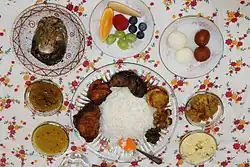 Mezban (locally known as Mejjan) is the Bengali word for special occasion feasts in the Chittagong region of Bangladesh.[16] Historically Mezbani is a traditional regional feast where people are invited to enjoy a meal with white rice and beef, besides other dishes rich in animal fat and dairy.[17] It is held on the occasions such as death anniversary, birth anniversary, celebrating successes, launching of a new business, entry into a new house, the birth of a child, marriage, aqiqah and circumcision, ear piercing of girls and naming of the newborn.[16][17] The invitation of the Mezban ceremony generally remains open for all and various people to different places and neighbourhoods convey the invitation for the feast. In urban areas, attending a mezban is by invitation only. Usually, the consumption of food at Mezbani takes place from morning to afternoon.[16]