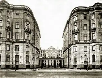 The apartment house occupies almost a whole quarter on Kamennoostrovsky Prospekt. The locals call it “the Benois House ” or “the house of the Three Benois”, because it was designed by three members of a famous family of architects—brothers Leon Benois and Albert Benois and their cousin Julius Benois.[3] The building was erected in 1911-1914 by order of the First Russian Insurance Company. The number of apartments during the construction of the house is 250, the number of front doors is 25, the number of courtyards is 12.[4]