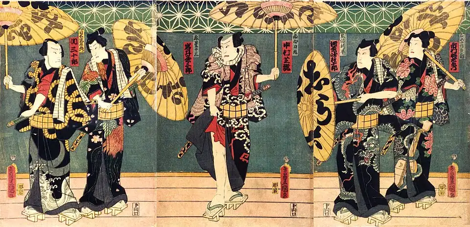 ![]() Woodblock printed playbill image from the March 1862 premiere at the Ichimura-za theatre in Edo, featuring actors Ichimura Uzaemon XIII (top/left), Nakamura Shikan IV (bottom/left), Seki Sanjūrō III (center), Iwai Kumesaburō III (top/right) and Kawarazaki Gonjūrō I (bottom/right). | |