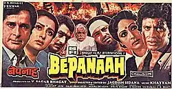 Bepanaah is a 1985 Indian Hindi-language film directed by Jagdish Sidana, starring Shashi Kapoor, Mithun Chakraborty, Poonam Dhillon, Rati Agnihotri, Suresh Oberoi, Madan Puri, and Kader Khan in pivotal roles.