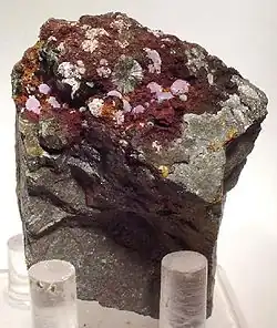 Crystalline beraunite on green kidwellite, Coon Creek Mine, Polk County, Arkansas, US. Size: 3.4 × 3.3 × 2.8 cm