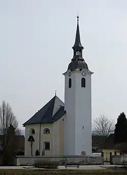 The local church is dedicated to the Feast of the Holy Cross.[9] The church was first mentioned in written sources in 1526.[7][8] The chancel of the church is Gothic, and the nave is Baroque. The church contains an image of Our Lady of Sorrows and there is an old wayside shrine near the church.[7]