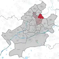 Location of Berkersheim (red) and the Ortsbezirk Nord-Ost (light red) within Frankfurt am Main