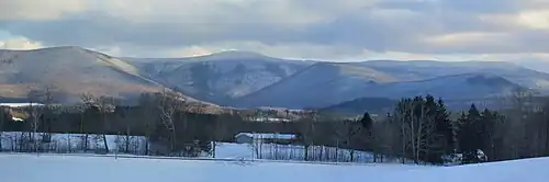 The Mount Greylock massif seen from the west in winter, with the deep valley known as "The Hopper" directly below the summit