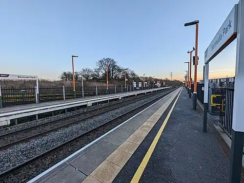 Bermuda Park railway station is a railway station in the Bermuda area of Nuneaton, Warwickshire, England.[1] It serves the Bermuda Park Industrial Estate, on the Coventry to Nuneaton Line between the existing stations at Nuneaton and Bedworth.[2] Funding for the new station was approved in December 2011, along with that for the new Coventry Arena railway station.[3] Both stations opened on 18 January 2016.[4]