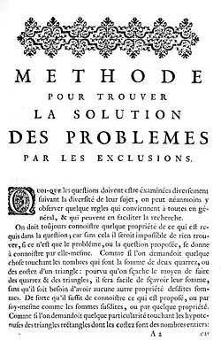 Frénicle's La Méthode des exclusions was published (posthumously) in 1693,[6] which appeared in the fifth volume of Mémoires de l'académie royale des sciences depuis 1666 jusq'à (1729, Paris),[7] though the work appears to have been written around 1640. The book contains a short introduction followed by ten rules, intended to serve as a "method" or general rules one should apply in order to solve mathematical problems.[3] During the Renaissance, "method" was primarily used for educational purposes, rather than for professional mathematicians (or natural philosophers). However, Frénicle's rules imply slight methodological preferences which suggests a turn towards explorational purposes.[8]