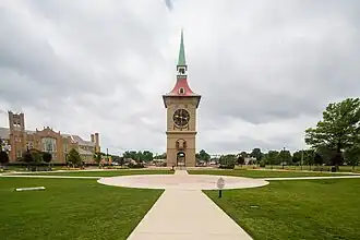 The idea of building the clock tower and plaza was first raised in 2001 while the city of Berne was planning for its sesquicentennial. Wanting to celebrate the city's Swiss heritage, it was decided to model the clock tower after the medieval Zytglogge in Bern, Switzerland, the oldest monument in that city (built c. 1220, repaired in 1405). The clock tower and plaza were given the name Muensterberg (Münsterberg) after the small Mennonite community in the Jura Mountains of Switzerland that Berne's first immigrants came from.[7] The clock tower was constructed in 2010. It stands 160 feet tall and 32 feet wide, weighing approximately 1,216 tons (over 2.4 million pounds).[36] It contains carillon bells created by the Verdin Company.