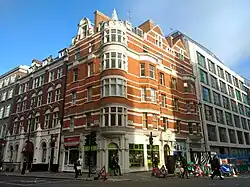 "a highly eligible investment in a substantial modern block of premises, known as the Berners-street Mansions, forming the corner of Berners-street and Mortimer-street opposite the Middlesex Hospital, of handsome elevation, the upper part arranged in convenient suites of residential flats, occupied by responsible tenants, and the ground-floor devoted to four capital light shops with basements, all well let (except one shop) at rising rents, and together of the present value of £1,490 per annum."[4]