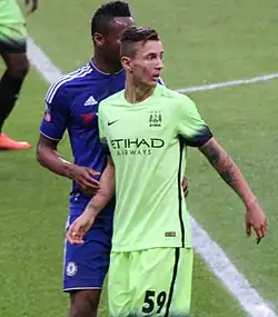 Celina made his official debut for the first team on 9 January 2016 in the FA Cup tie against Norwich City, coming on as an 85th-minute substitute in a 3–0 away win.[8] Later he also made his first Premier League appearance by playing as a substitute in a 3–1 home defeat against Leicester City on 6 February, assisting Sergio Agüero for Manchester City's only goal and becoming the first Kosovar to play in England’s top tier.[9] On 21 February, he made his first appearance in Manchester City's starting XI in an FA Cup fifth round match against Chelsea at Stamford Bridge.[10] Celina made 4 appearances for Manchester City during his first season in senior football.[11]
