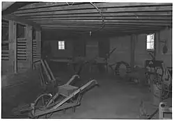 The lower level, unlike the main floor, contains windows spaced at regular intervals. These windows, inserted in the new foundation at the time that the barn was moved, were taken from the original foundation. The west facing door, located on this level, also slides on an overhead track. On the south side a fire door was added during the recent rehabilitation to satisfy fire codes.[4]