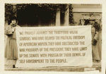 In late August 1918, she joined the White House pickets. She participated in a protest at the Lafayette Monument. Among forty protesters, the group burned papers printed with President Woodrow Wilson's "empty words about democracy".[3] She spoke at the demonstration: