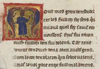 One of Bertran's last works was written between the Seventh and Eighth Crusades (1260–1265) and bewails the decline of Christendom in Outremer. Bertran's most famous work is probably Us cavaliers si jazia ("Once a gentleman was lying"), which has been translated into English.[8] Among the other troubadours with whom Bertran composed tensos were Guigon de Cabanas (Vist hai, Bertran, pos no-us uiron mei oill and Amicx Guigo, be.m asaut de ton sen) and Sordello (Bertrans, lo joy de dompnas e d'amia and Mout m'es greu d'En Sordel, car l'es faillitz sos senz). Against Sordello, Bertran believed that the heart should be given only to the noblest ladies and not divided among cowards.[9] Nonetheless, he was following Sordello when he composed a hybrid of a sirventes and a planh.[10]