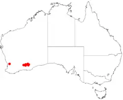 This species of Bertya grows on sand dunes near salt lakes in open mallee, on sand or pebbly sandy clay between Coolgardie and Norseman in the Coolgardie and Mallee bioregions of Western Australia.[3]
