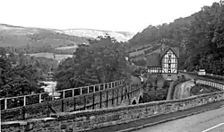The six-arch stone-built Berwyn Viaduct is a Grade II listed building directly to the west of the original station,[6] and now forms part of the station as the platform extends over most of the viaduct's length. The viaduct lies between the River Dee and the A5 road. In addition to crossing a steep-sided valley it also forms a bridge over the B5103 (which crosses the Dee on another viaduct at a lower elevation) and the unnamed brook draining from the north side of Vivod mountain.[7]