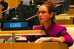 Kadare presented her credentials to UN Secretary-General Ban Ki-moon on 30 June 2016, and since then has been the Ambassador Extraordinary and Plenipotentiary Permanent Representative of Albania to the United Nations in New York.[7][1] She is Albania's first female Ambassador to the UN, in the country's 65 years of UN membership.[8] She was appointed to serve concurrently as Albania's Ambassador to Cuba.[1]