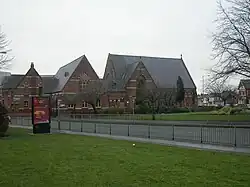 Gothic revival. A low, spreading complex, conspicuously sited at fork between Old and New Bury Roads. Red brick with bands, window heads, tympana etc in other colours. Steep slate roofs. Dated 1865 in head of gable front, which has stone plate-tracery rose window under 2 centred arch. Short transepts have similar gables. Beyond east end the associated buildings present steep gables, one to north, two to south.[1]