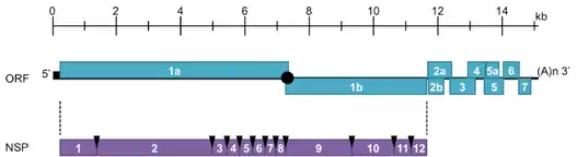 Two large ORFs (1a and 1b) comprise 75% of the viral genome. They are translated and processed into 14 non-structural proteins including four proteases and the RNA-dependent RNA polymerase.[32]