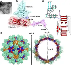 Viruses in the genus Betanodavirus are non-enveloped, with icosahedral geometries and T=3 symmetry.[2] The diameter is around 37 nm. The virus-like particle contains 180 subunits of the capsid protein, and each capsid protein (CP) shows three major domains: (i) the N-terminal arm, an inter-subunit extension at the inner surface; (ii) the shell domain (S-domain), a jelly-roll structure; and (iii) the protrusion domain (P-domain) formed by three-fold trimeric protrusions.[9]