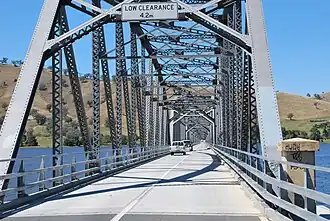 The Bethanga Bridge is a steel truss road bridge that carries the Riverina Highway across Lake Hume, an artificial lake on the Murray River in Australia. The dual heritage-listed[1][3] bridge crosses the border between the Australian states of New South Wales and Victoria, linking the Victorian towns of Bellbridge and Bethanga with the regional New South Wales city of Albury.
