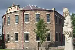 The brick chapel is built in an Italianate style with a stuccoed facade and a slate roof.[5] According to Nikolaus Pevsner, the Methodists chose this style of architecture "in order not to look Anglican."[12] Its ground floor is rusticated and has a single-storey portico, extending along the full length of the chapel frontage. This consists of a heavy cornice supported on pairs of fluted Corinthian columns. Over the portico, in the centre of the upper storey, is a Venetian window, with two sash windows on each side. At the summit of the frontage is a central pedimented gable.[6] On each side of this is a massive decorated cornice.[3] The building extends back for five bays, and at the rear is a shallow curved apse.[6] The rear of the building is built in Flemish bond brickwork.[6]