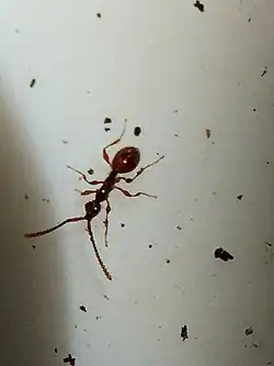 The mesothorax is almost glabrous, and much more shining than the rest of the body. The abdomen is haired all over, but not very thickly, and the hair is longish, and whiter towards the apex. The tibiae and tarsi are covered with short, stiff white hairs, the femora more sparsely with longer, soft hair. At the apex the metanotum is convex, projecting into sharp teeth at the sides, and is very closely united to the petiole, which is longer and a little narrower than it.[3]