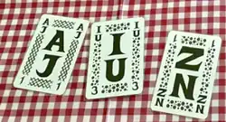 Shahriari's second design was called Wibbell. This game uses a custom deck of 48 cards; each card has a pair of letters, a number and border art. The purpose of the game is to win cards by shouting out words that use letters from a card on the table and a card in one's hand.