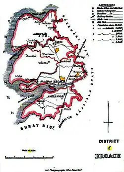 Map of Broach or Bharuch district, Bombay Presidency, British India, 1877
