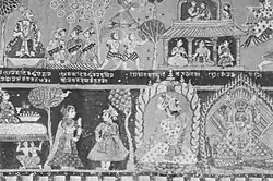 The construction of this palace was completed in 1708 after which Bhupatindra Malla had a Chitrakar paint frescoes on the second floor.[114] The walls on the second floor of the palace are painted with Paubha paintings depicting various religious scenes and the portraits of the royal figures.[114][115] The central fresco contains a portrait of Vishvarupa and his consort.[62] The Vishvarupa has multiple layers of head while the mythical Mount Meru forms the background.[114] The central head of the Vishvarupa has the face of Bhupatindra Malla.[62][114] On one of the eyebrows of the figure, the snake king and his army of serpents is seated.[114] Similarly, on the two shoulders of the Vishvarupa stand Ganesha and Kumara while the chest of the Vishvarupa contains a scene from the Ramayana where Rama and his allies are seated in a golden chariot and are fighting a ten headed Ravana and his army.[114] A lotus plant sprouts from the navel of the Vishvarupa, where the creator deity Brahma is seated.[114] Brahma is being attacked by demon forces of Madhu and Kaitavya and is being defended by Shiva and his divine army.[114] Similarly, the Vishvarupa is embracing a female figure who has a white complexion and a distinctive nevus on her chin, identifying her as Queen Vishva Lakshmi.[114] Similarly, her ribbon which forms an elaborate headwear contains the word 'Sri Bhupatindra' written in the Newari script, further identifying her as Bhupatindra's queen.[62][114] Vishva Lakshmi is embracing her consort with her left arm while her right arm which holds a golden cup, contains a gold bangle the upper part of which has been modified into the figure of a blue coloured Bhairava and his consort Bhairavi.[114] The Vishvarupa painting although heavily damaged has been described as the epitome of Nepalese painting and one of the rarest in the world.[114] Historian Purushottam Lochan Shrestha further writes that: