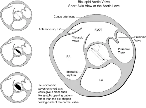6. ^ a b c Ward, C. (2000-01-01). "Clinical significance of the bicuspid aortic valve". Heart. 83 (1): 81–85. doi:10.1136/heart.83.1.81. ISSN 1355-6037. PMC 1729267. PMID 10618341.