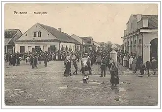 Market square and Bielyja Lauki (on the right) in Pruzhany. 1917