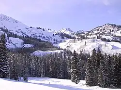 Big Cottonwood Creek is located in the Wasatch Mountains just east of Salt Lake City. It is part of the Big Cottonwood Creek Watershed, which ranges in elevation from 5,000 to 10,500 feet with the headwaters around 9,600 feet.[3] The creek flows through the Big Cottonwood Canyon in a westerly direction until it emerges into Salt Lake Valley about eighteen miles (29 km) from its highest source. Thence its course is northwesterly through Cottonwood Heights, Holladay, and Murray, Utah for a little over twenty-four miles from the headwaters (39 km) until it empties into the Jordan River about five miles (8.0 km) south of Salt Lake City.[3] The water eventually flows into the Great Salt Lake. In the summer, its waters are all used for irrigation purposes. From its source to its original outlet in the Jordan River is about twenty-six miles.[4]