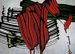 8. ^ Shanes, Eric (2009). "The Plates". Pop Art. Parkstone Press International. p. 125. ISBN 978-1-84484-619-1. Here Lichtenstein emulated the appearance of four typical Abstract Expressionistic brushstrokes, complete with drips except that he did so on a vast scale in comparison with such marks in reality. He also set them against a background of Benday dots which brings into play the notion that we are not looking at an imitation of real brushstrokes, but at a reproduction of such an imitation. We are therefore two stages removed from the originals (and of course the reproduction in this book takes us yet another stage from that source). A further pictorial witticism arises from the fact that in their original form Abstract Expressionist brushstrokes would have been created in seconds, whereas Lichtenstein's marks took days to create because of their size, detailing and relative complexity.