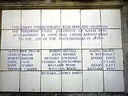 Biggar's family, which now included nine daughters and a son, Robert, departed from Portsmouth on HMS Weymouth on 20 January 1820, arriving in Algoa Bay on 15 May 1820. His younger son George was born during the voyage. The family was allotted the Woodlands farm, near Bathurst on 6 September 1826.[2] Ten years later, in May 1836, Alexander moved to the frontier trading centre of Port Natal, in the later Colony of Natal, initially with his younger son George. Once there, he founded the Port Natal Volunteers in 1837, the first white military group of the region, though they almost immediately disbanded. Alexander had 13 children in total. This included a son by a Zulu woman, as was the practice among Englishmen in the fledgling settler community.[3]