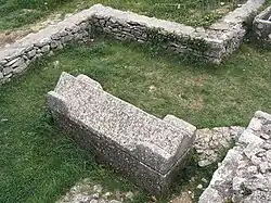 Built on the remains of an early Christian three-nave basilica, the early Croatian church of St. Martha was a three-nave structure with an angular apse and a Romanesque bell tower that was added in 1197.[1] The church measures 14.8×8 m. Close to the ruins, the remains the a late antiquity early Christian cemetery with 15 graves were discovered in the 1902–1905 excavations, as well as 13 early medieval Croatian graves, mostly from the 10th and 11th centuries.[5][1] In an early Christian sarcophagus dated to the 9th century a pair of earrings and an iron knife were found.[5] Around the complex, walls that enclosed it are still visible.[5] Numerous fragments of Croatian interlace from the 9th and the 10th centuries have been found, including a late 8th-century inscription mentioning a Croatian nobleman (župan) and a Croatian ruler.[1] This inscription is the oldest known reference to the Croatian name after their migration.[1] The reconstructed quadrilateral ciborium that was found in pieces is now kept at the Museum of Croatian Archaeological Monuments in Split. Six stone lintels have also been found in the vicinity of the church; they may have belonged to the buildings of the ducal palace.