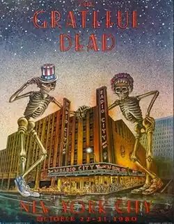 Some of the image reuses actually served, Restani noted, to "[enhance] the reader's understanding of the biographical text." In a footnote, she pointed to one, a poster commemorating a special 15th anniversary concert series by the band at Radio City Music Hall in New York.[a] It showed two giant skeletons, iconography commonly associated with the band, standing next to the theater. Management there was unfamiliar with that use and thought the band was implying that Radio City was soon going to close down, leading to a lawsuit that was withdrawn after the band's management explained the imagery.[24][b] Other images, while they might not have directly enhanced the text, nevertheless served to "graphically [represent] the fact of significant Grateful Dead concert events selected by the Illustrated Trip's author for inclusion in the book's timeline." She noted how one, of a Winterland Ballroom show in the late 1960s, conveyed a fact not mentioned in the accompanying text: that at that point in their career the Dead were still getting second billing to Jefferson Airplane.[26]