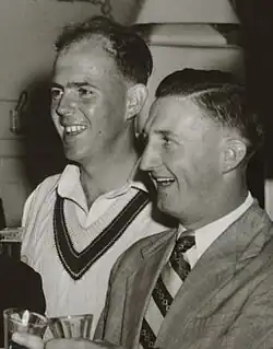 After injuring his knee in a festival match at the beginning of the tour at East Molesey,[46] Johnston attributed the injury to a lack of attention to detail. His new boots had spikes that were longer than usual, and the physiotherapist had failed to strap his ankle before the match. His knee soon failed.[47] Johnston missed the first six first-class matches,[48] and with it a month of cricket. He returned against the Minor Counties in late May and took 3/20 in an innings win.[6] He staked his claim for selection in the final two tour matches before the Tests; he took 4/65 and 3/49 against Sussex and then led the way in a win over Hampshire, much as he did five years earlier, taking 5/75 and 4/21.[6] He had taken 20 wickets at 13.35 in his four tour matches and was duly selected to play in the First Test at Trent Bridge.[6] He was economical but unpenetrative, conceding 36 runs in 36 overs without taking a wicket in a rain-affected draw.[6][49] Between Tests, he removed Hutton in both innings of a match against Yorkshire, but it came at a cost; he ended with 4/186.[6][7] He took match figures of 4/161 in the Second Test but England held on for a draw with three wickets in hand,[6] as a recurrence of the knee injury while fielding intervened again.[50] He then had an operation to remove cartilage in his right knee; this allowed him more leg movement but also destabilised his knee.[51] The same surgeon had operated on Compton's knee.[47] After missing another month of cricket, Johnston returned with a remodelled action,[52] and hauls of 4/51, 6/63 and 6/39 against Surrey, Glamorgan and Essex respectively,[48][53] saw Johnston return for the Fifth Test at The Oval. Although the pitch was helpful for spin,[54] a total of 74 overs in the match yielded 3/146, as Johnston was unable rekindle the form of 1948 following his knee injury. Compton and Edrich batted cautiously to ensure the victory that saw England reclaim the Ashes 1–0.[54] He managed only seven Test wickets at 49.00,[12] but his first-class form remained strong. After the Tests, Johnston took match figures of 11/73 and 9/124 in consecutive matches against Kent and the South of England; Australia won both by an innings.[6] He ended with 75 wickets at 20.54 for the entire tour.[11][12] His injuries were considered a major factor in Australia's loss of the series.[4][46]