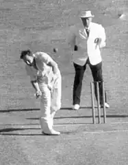 Johnston's best match performance came in the only loss in the Third Test at Adelaide.[12] This happened when captain Lindsay Hassett was a late withdrawal due to injury, leaving Australia with an unbalanced team with only four specialist batsmen who could not consolidate the work done by the five specialist bowlers.[38] It was in this match that Johnston passed 100 Test wickets, the fastest player to do so.[39] Exploiting a wet patch at the striker's end,[40] Johnston took 6/62 in the first innings as 22 wickets fell on the first day in treacherous batting conditions; however he was unable to stop an Australian defeat, taking only 1/50 in the second innings as the tourists reached their target of 233 with six wickets in hand.[6][12]