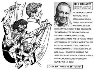 Of his many illustration assignments, Lignante wrote, "None of these compare to the instant art of the courtroom. No roughs, research, conferences, assistants, editors and no time. What you see, you draw, so that the world can see it too." In the 26 years he spent as a courtroom artist for ABC Network News, he illustrated 60 trials, including those of Sirhan Sirhan, Charles Manson and Patty Hearst.[1]