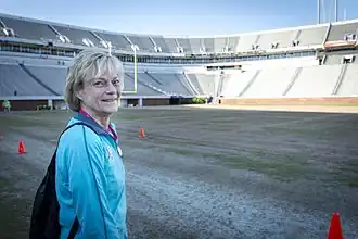 The Tenth Anniversary of the 'Charlottesville Men's Four Miler race was held on Saturday May 24, 2014. The starting line was at the west parking lot of Scott Stadium. The signal to start was flagged by former UVa Women's Basketball coach Debbie Ryan, inducted into the Women's Basketball Hall of Fame (add a link ?) in 2008. Runners quickly moved along Alderman Rd. towards McCormick Rd., Rugby Road and onto Grady Ave. The course continued to Cabell Ave., Burnley Ave., and Tunlaw Place. At Tunlaw Place participants turned left onto Rosser Ave. and then back to Rugby Rd., and McCormick Rd. In the intersection of McCormick and Alderman runners turned left, and then left again onto Whitehead Rd.. Finally, onto Stadium Rd., and the Scott Stadium tunnel, which leads into the field where the Finish Line was set up.[3]