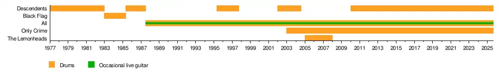 Stevenson is an original member of the Descendents forming in 1978. The Descendents put out a single called "Ride the Wild / It's a Hectic World" in 1979. In 1982 they put out their first album Milo Goes to College. After the album, singer Milo Aukerman went to college, the band played rarely, so Stevenson joined Black Flag. He left Black Flag in 1985 to reform the Descendents. The Descendents became All in 1988 after Aukerman left once again. The Descendents would form again from 1996 to 1997 and then in 2002, before going on hiatus. From 2003 to 2007, Stevenson played in smaller bands until All played shows again in 2008. In 2010, the Descendents reformed again.[8]