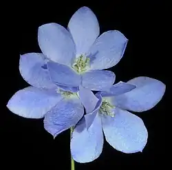 The flowers are arranged singly or in groups of up to four on a rachis 10–15 mm (0.39–0.59 in) long, each flower on a nodding pedicel 6–10 mm (0.24–0.39 in) long. The sepals are silky hairy, 2–3 mm (0.079–0.118 in) long and fall off as the flower develops. The petals are blue, white or pink, 5–11 mm (0.20–0.43 in) long, about 3 mm (0.12 in) wide and free from each other. Flowering occurs in late spring and summer, and the mature fruit is a green, spindle-shaped berry 20–25 mm (0.79–0.98 in) long that turns purplish as it ages.[3][4]