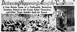 Arnold's band performed with the Dolly Sisters, who were then internationally famous and were courted by King of Denmark among others.[8] They traveled in elite circles: The Dolly Sisters in 1926 organized a gala fund raising concert and chose Arnold to organize the music. Performers included Josephine Baker and Broadway star Harry Pilcer.[9] In 1932 the Billy Arnold band was playing at the Casino in Cannes when a lion, part of an act at the Casino, "broke out of her cage and went for a stroll near the tea tables." Guests, including Lord and Lady Mountbatten and Lady Oxford and Asquith, began to panic. "Billy Arnold...sent his musicians into action again. They played frantically and the blaring strains of "Happy Days" rose above the shouts of the crowd....the lion's roars sounded above the wild playing of the orchestra and brought its trainer on the run." The trainer and his assistant managed to recapture the lion.[10]