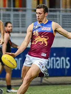 Evans was drafted by the Brisbane Lions with their first selection and the fourth overall in the 2015 AFL rookie draft.[2] He made his debut in the fourteen point loss against Gold Coast in round 19, 2015 at the Gabba.[3] After seven matches with Brisbane, He was delisted at the conclusion of the 2016 season.[4]