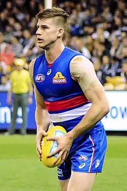 Having played football at his school, Xavier College and Oakleigh Chargers, he was drafted by the Carlton Football Club with their first selection and fifth overall in the 2015 rookie draft.[1] He spent two years on Carlton's list before he was delisted at the end of the 2016 season without playing a senior AFL match.[2] He spent the 2017 season playing with Footscray in the Victorian Football League (VFL) before he was drafted by the Western Bulldogs with their first selection and ninth overall in the 2018 rookie draft.